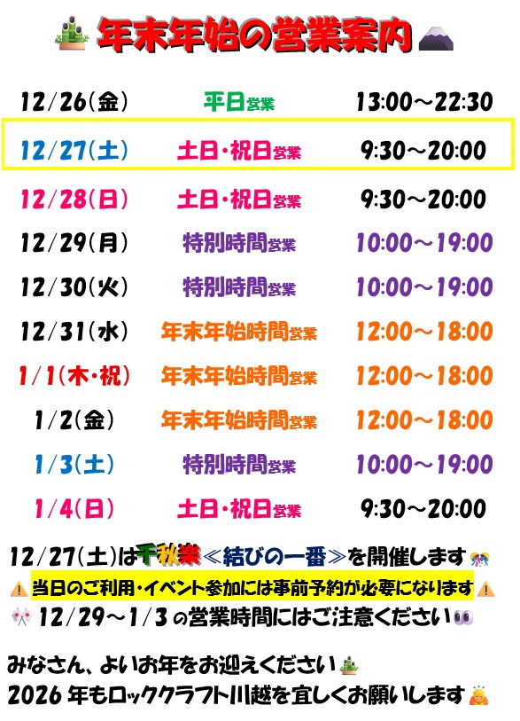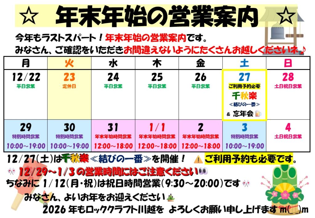 ■ 年末年始の営業案内 ■ 広告 2025年12月3日 年末年始は休まず営業します💖ただ営業時間が異なるのでお間違えの無いようにお越しください👀 また12/27(土)はイベント開催の為、イベント参加も一般ご利用も事前予約が必要になりますのでごご注意ください⚠ クライミング・ボルダリングを楽しみながら、良い年を迎えましょう🎵